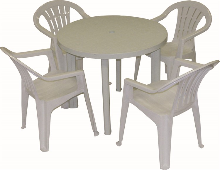 Trädgårdsgrupp, 90cm ø, vit plast, ett bord och fyra stolar