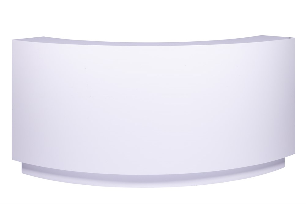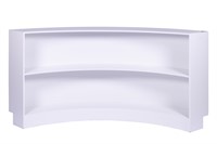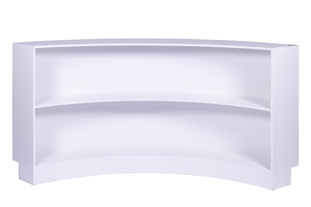 Rundad disk i vitt trä med hyllplan, 210x30x100cm (LxBxH)