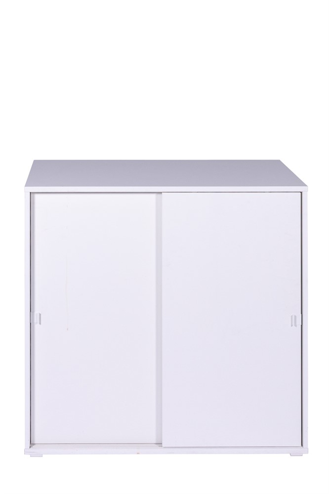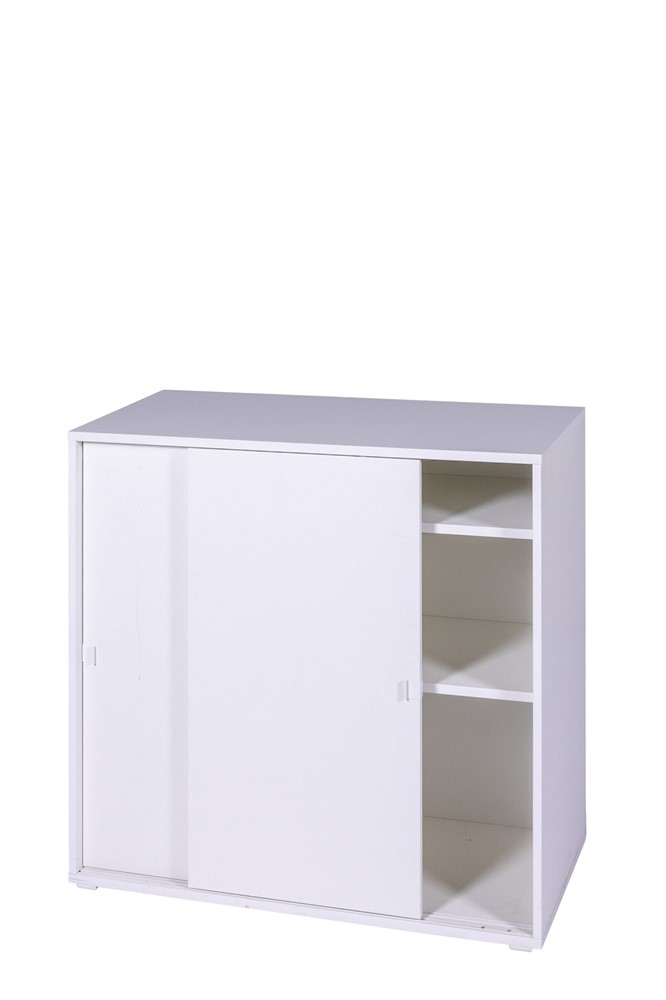 Skåp med skjutdörrar i vitt trä (ej låsbart), 95x47x90 cm (LxBxH). OBS! Bakstycket är omålat brunt